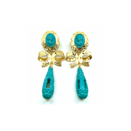 • PENDIENTES ORO 18 KILATES CUBANAS CON CAMAFEO Y LAZO TALLADO CON PALO TALLADO